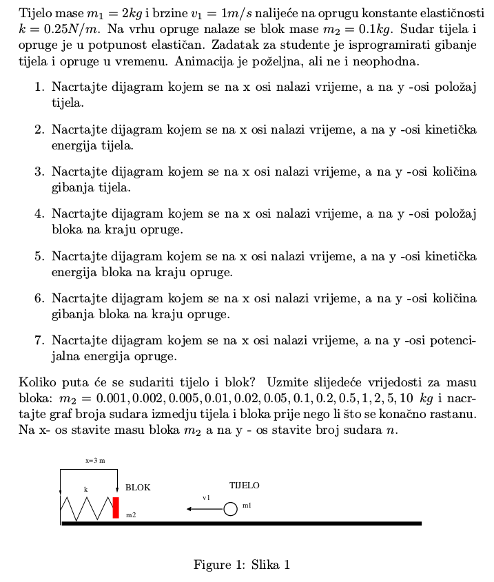 - Simulacija se sastoji od sustava od tri objekta: kugle, bloka i opruge